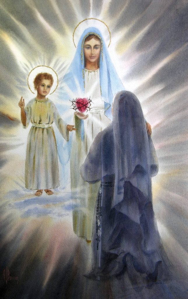« Le 10 décembre 1925, la très Sainte Vierge lui apparut et, à côté d’elle, porté par une nuée lumineuse, l’Enfant-Jésus. La très Sainte Vierge mit la main sur son épaule et lui montra, en même temps, un Cœur entouré d’épines qu’elle tenait dans l’autre main. Au même moment, l’Enfant lui dit : “ Aie compassion du Cœur de ta très Sainte Mère entouré des épines que les hommes ingrats lui enfoncent à tout moment, sans qu’il y ait personne pour faire acte de réparation afin de les en retirer.”